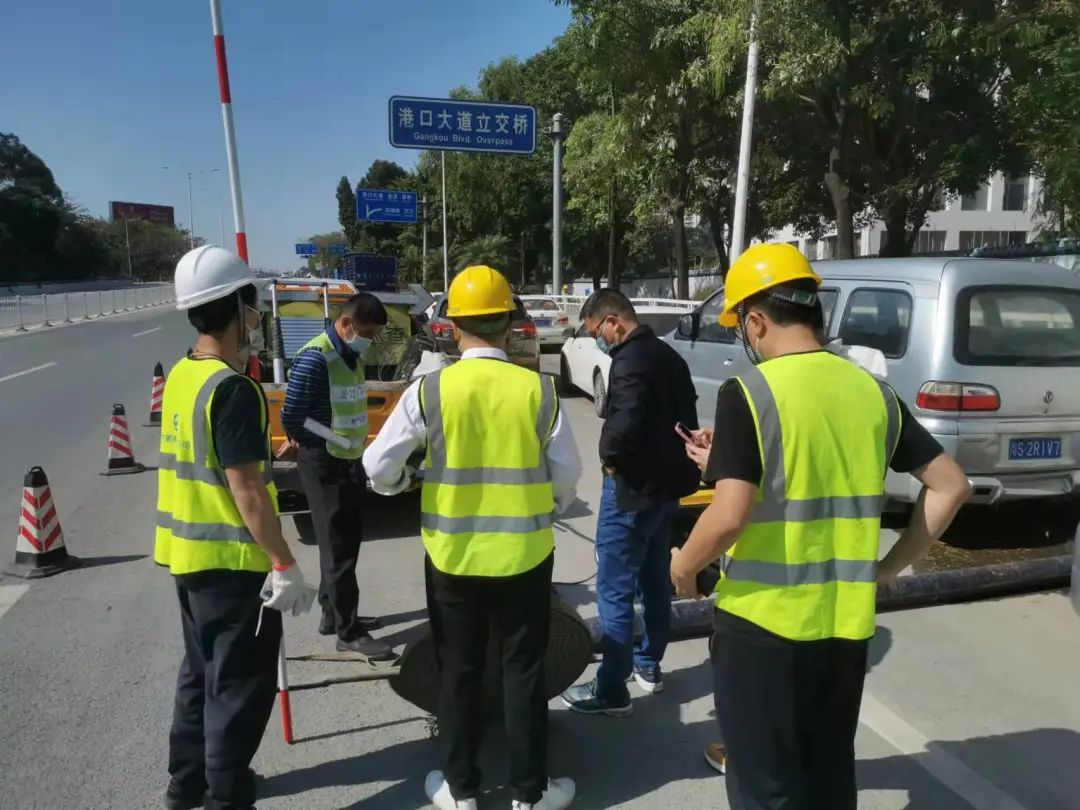 在港口大道万江欧景城路段,巡查人员经排查发现雨水管道积淤严重、检查井满水,已第一时间报告主管部门和监理单位,并协同原运维单位进行管道降水位和清疏工作。