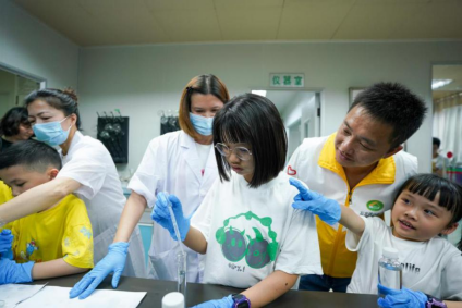 “如何判断水质是否符合出厂要求呢?”小学员们带着这个疑问,化身“小小实验员”,在工作人员的指导下,对不同的水进行酸碱度检测试验,通过精准滴定操作及颜色比对观测,小学员们对此惊奇不已。