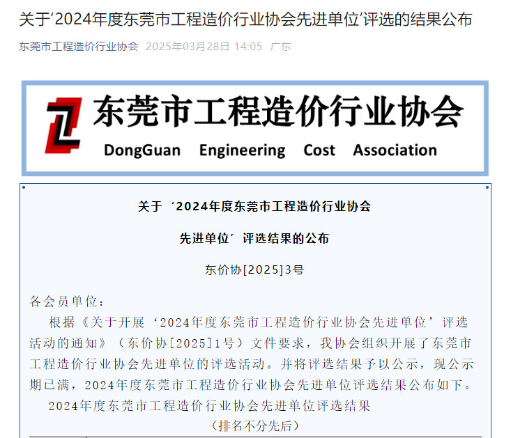 恒业公司荣获“2024年度东莞市工程造价行业协会先进单位”称号